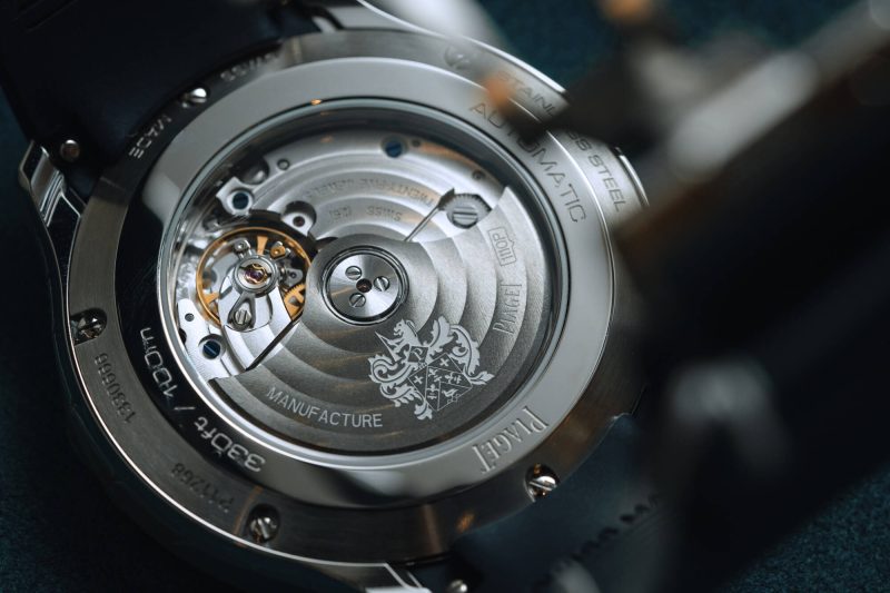 Mecanismul de manufactură: În interior regăsim calibrul automatic 1110P, un mecanism fiabil și frumos decorat (cu masă oscilantă finisată Côtes de Genève și stema Piaget), vizibil prin spatele din cristal safir.